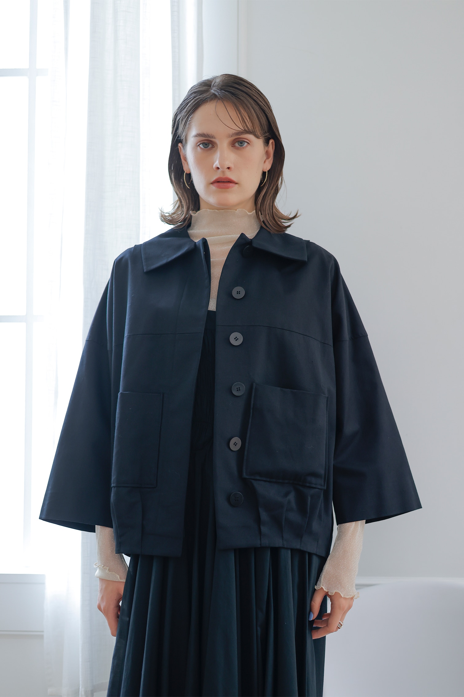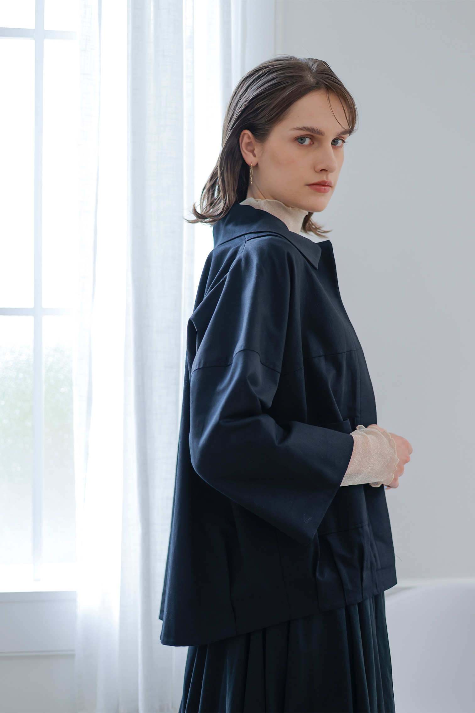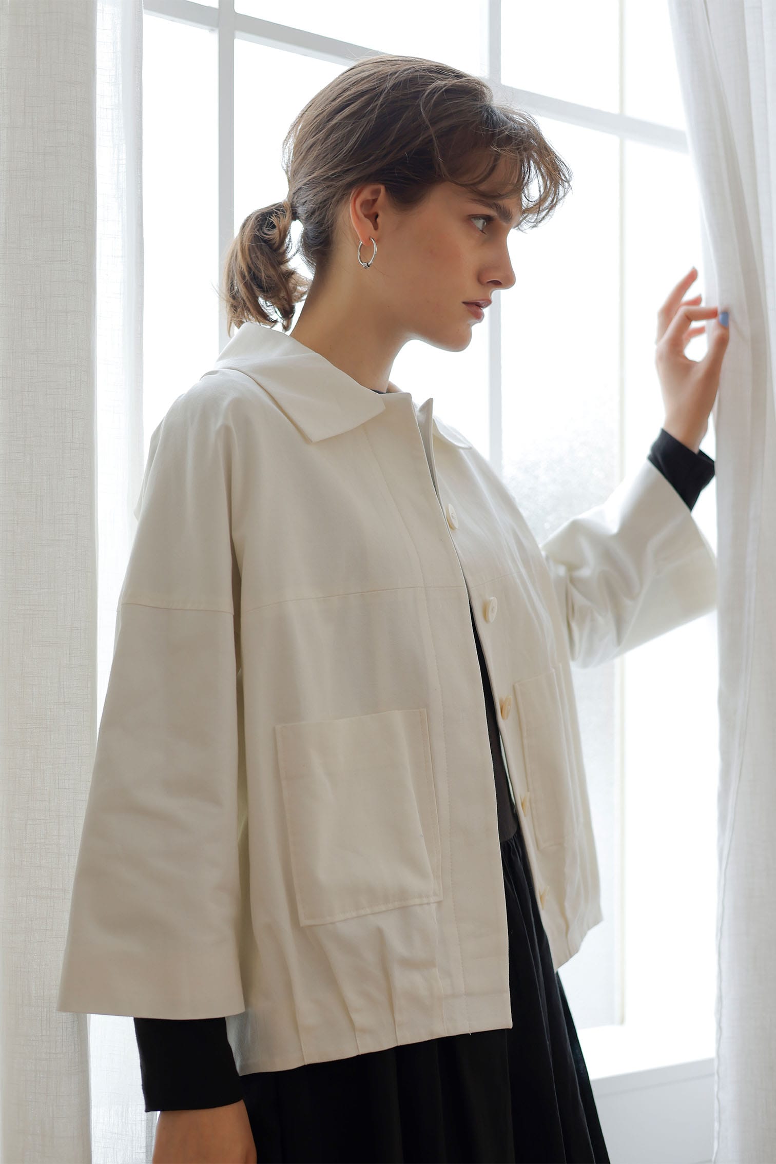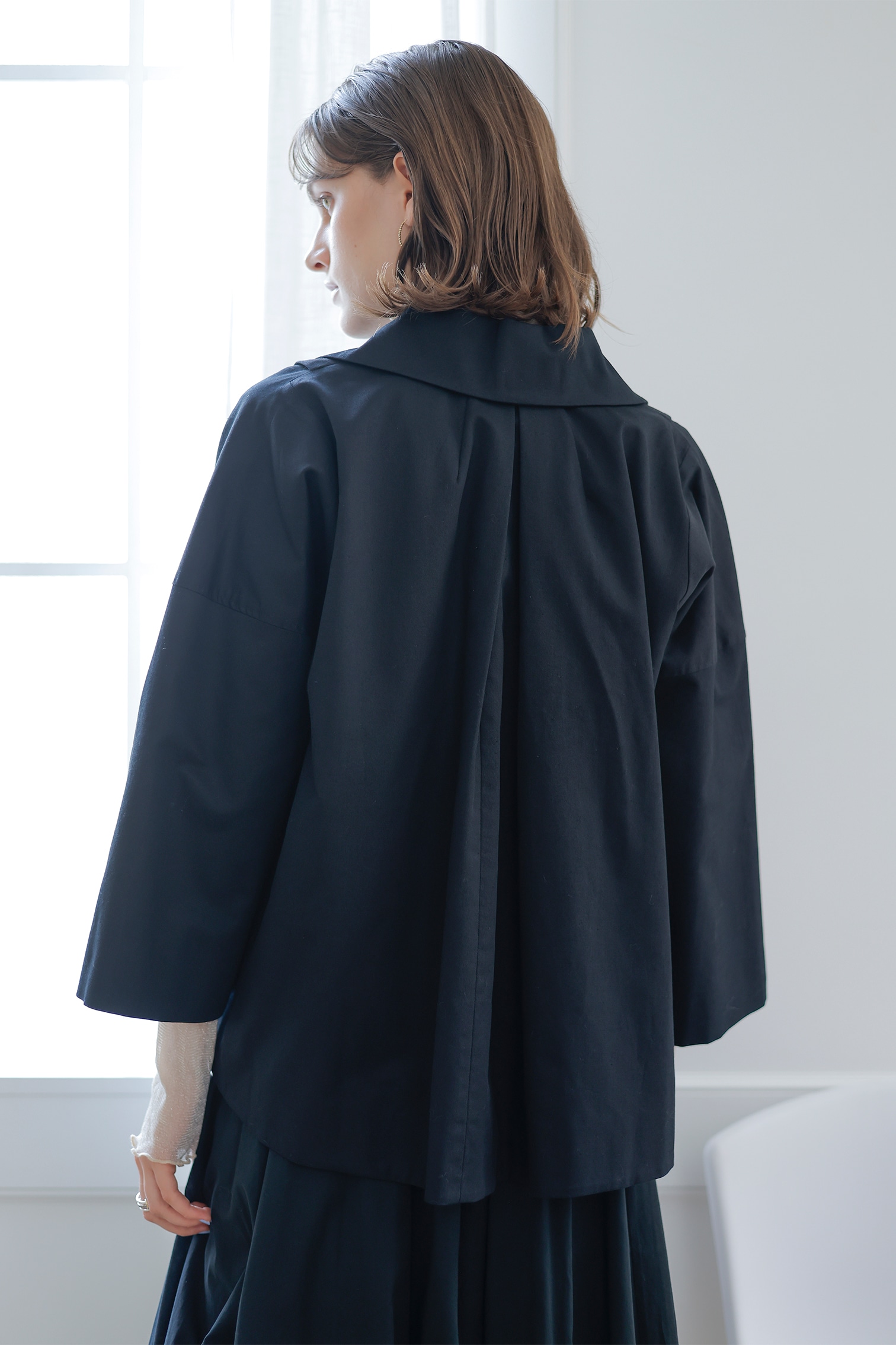 クラシックなシルエットに現代的なエッセンスを加えたSOLARA JACKET(ソララ)。大きめの襟が顔回りをすっきりと見せ、裾のタックや背中のプリーツがさりげない動きをプラス。少し短めの袖丈がポイントです。コットンとリネンの混紡素材にコットンサテンの裏地を施した仕立てで、着心地もデザインもこだわり抜いた一着です。デイリーにも特別な日にも、あなたの装いに品よく寄り添います。