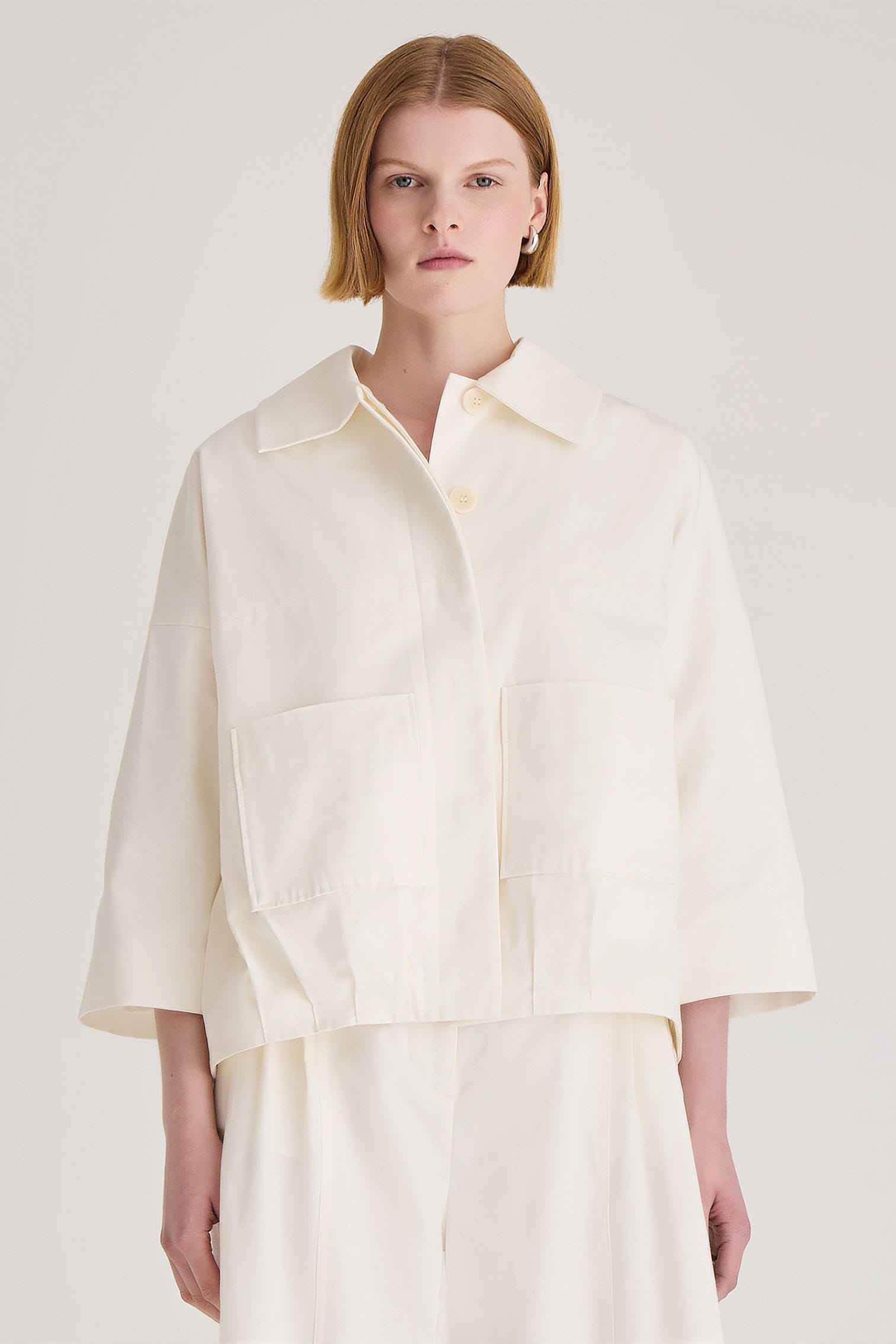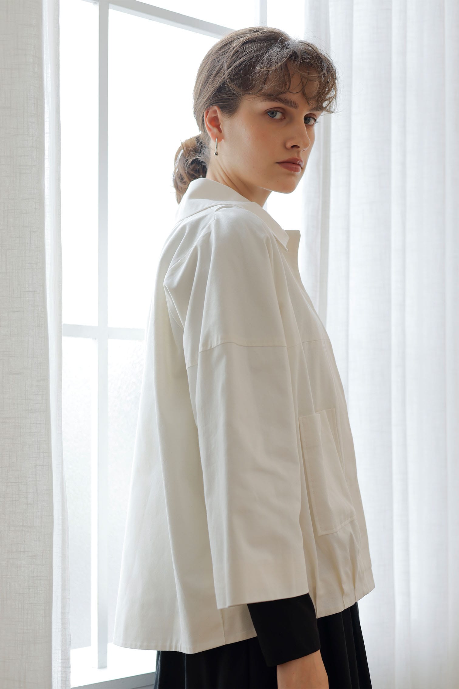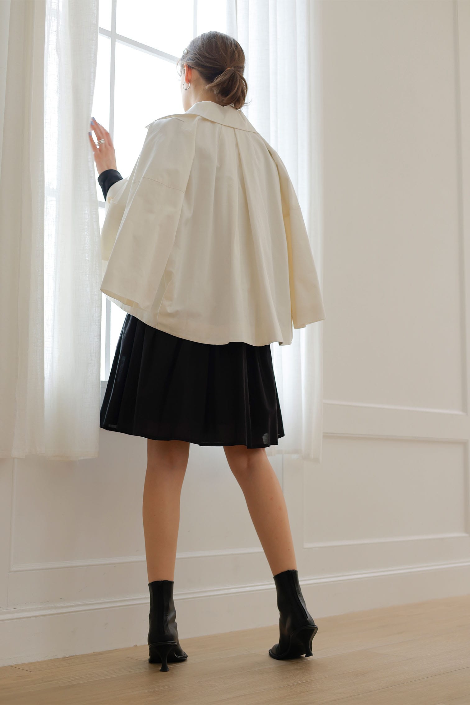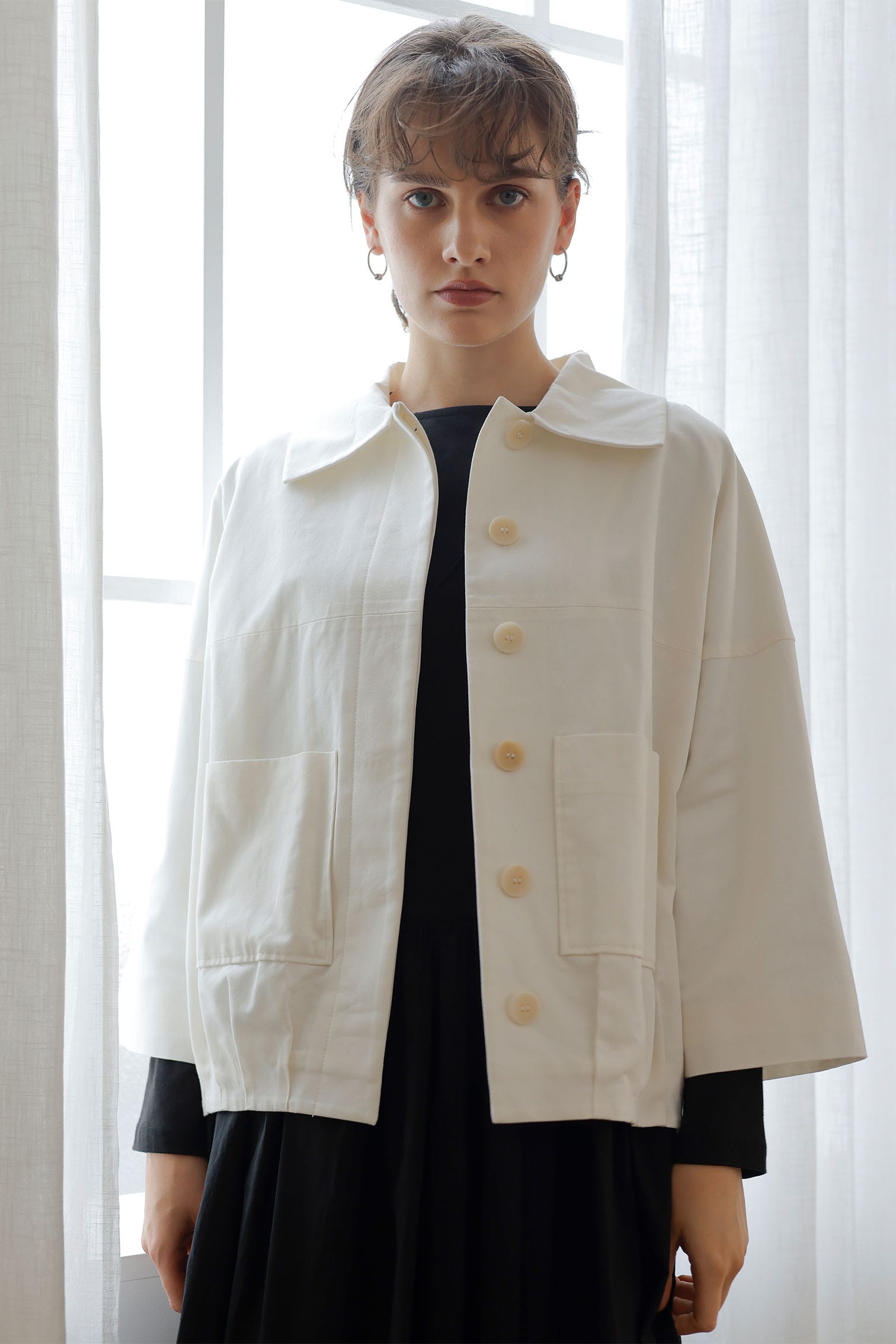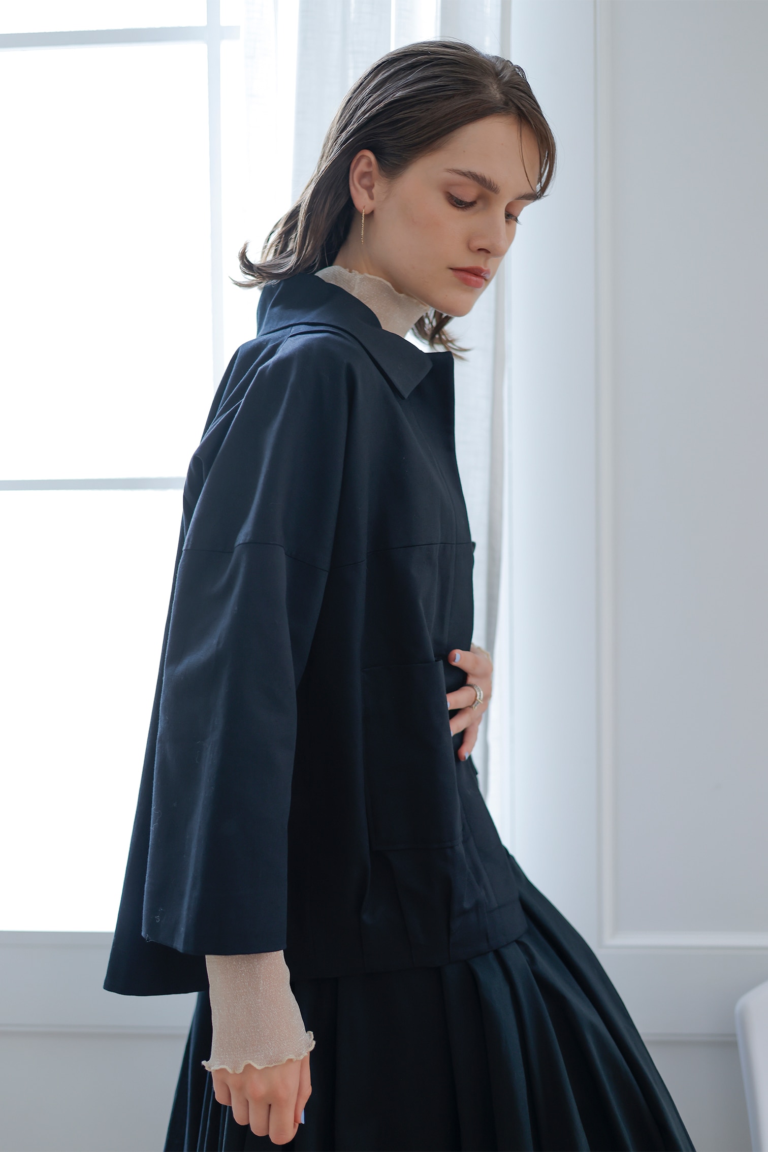 クラシックなシルエットに現代的なエッセンスを加えたSOLARA JACKET(ソララ)。大きめの襟が顔回りをすっきりと見せ、裾のタックや背中のプリーツがさりげない動きをプラス。少し短めの袖丈がポイントです。コットンとリネンの混紡素材にコットンサテンの裏地を施した仕立てで、着心地もデザインもこだわり抜いた一着です。デイリーにも特別な日にも、あなたの装いに品よく寄り添います。