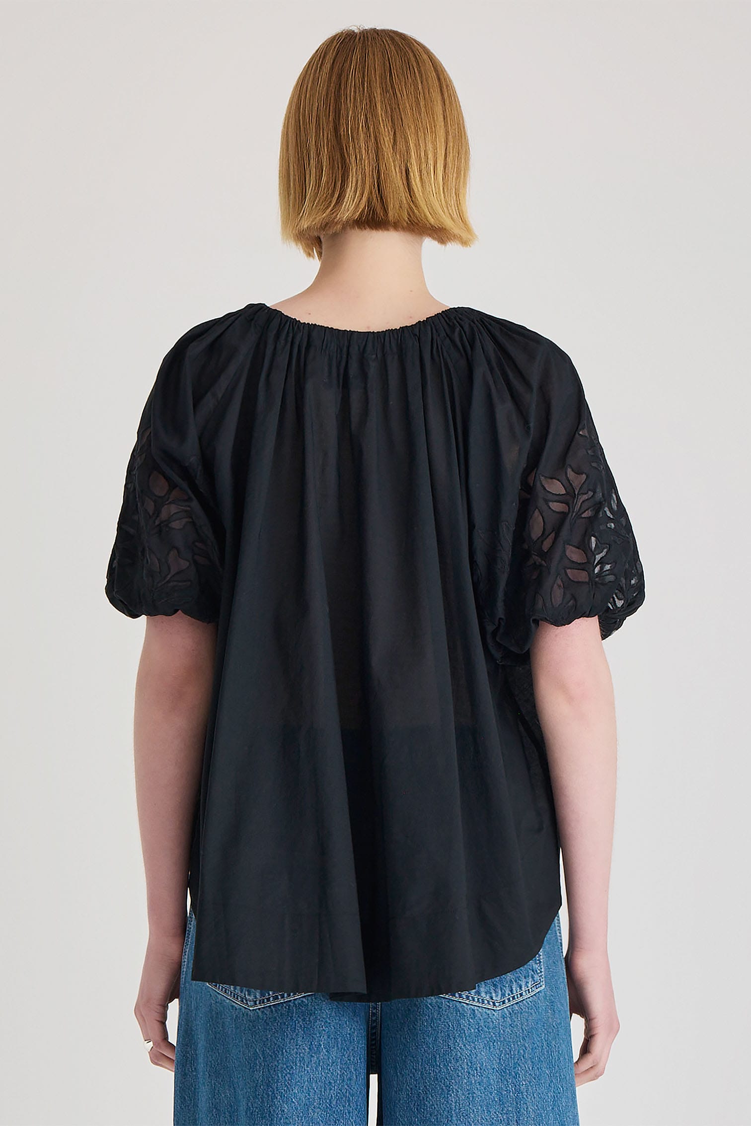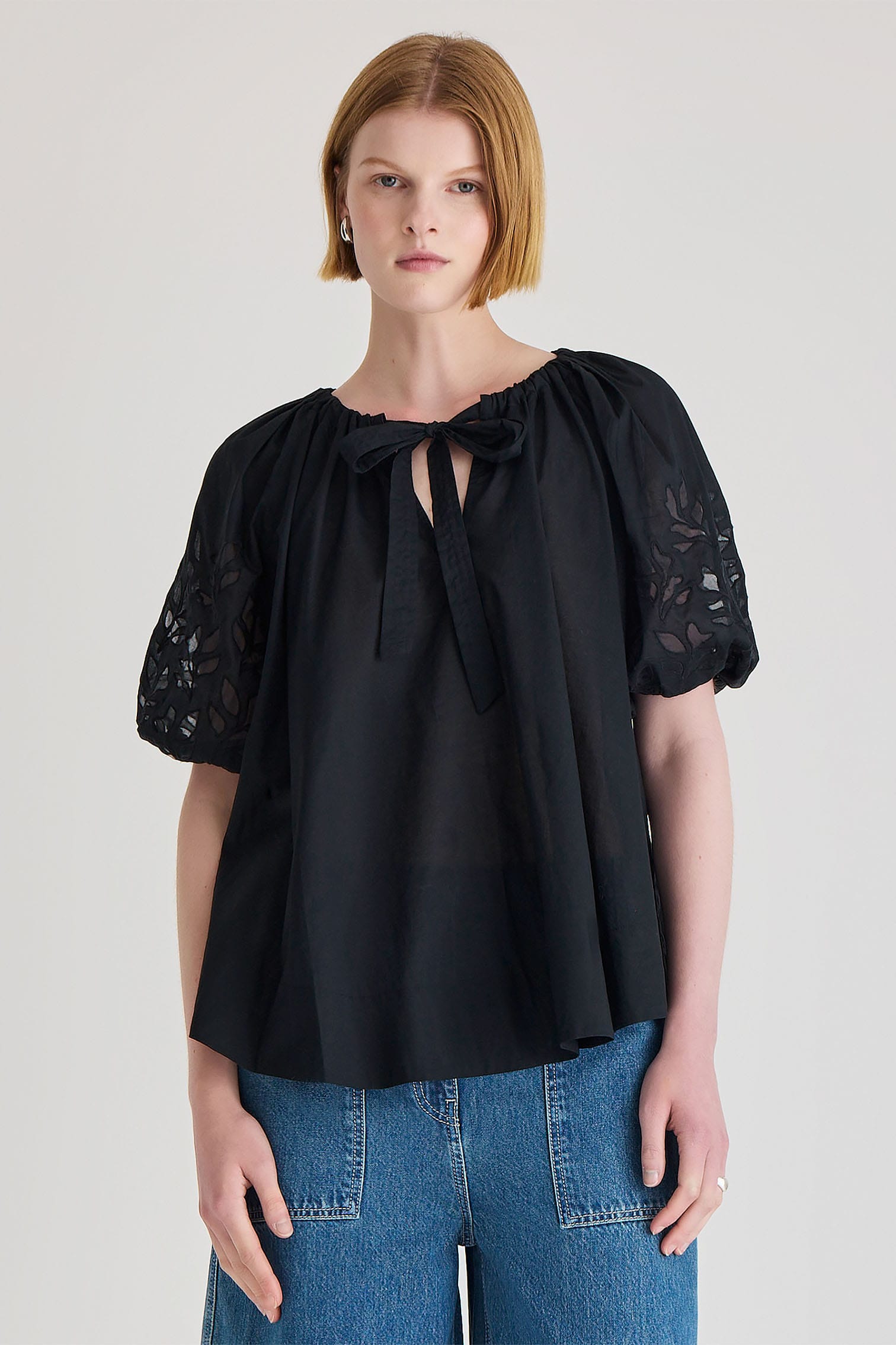 柔らかなコットン素材にシルクオーガンザのフラワー刺しゅうがそっと咲くブラウスLUMI BLOUSE(ルミ)。パフスリーブがロマンティックな印象を添えつつ、モダンなシルエットに仕上げています。首元のリボンは結び方次第で印象を変えられるフェミニンなアクセント。いつものスタイリングに芸術的なニュアンスを添えるタイムレスな一枚です。