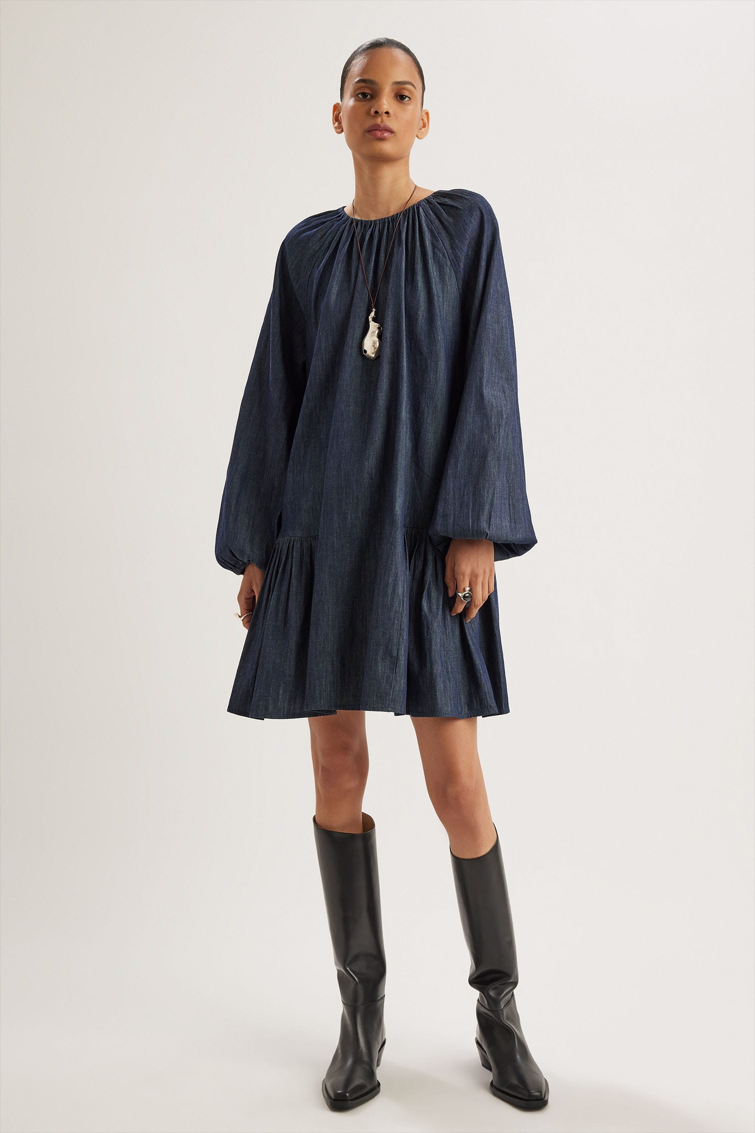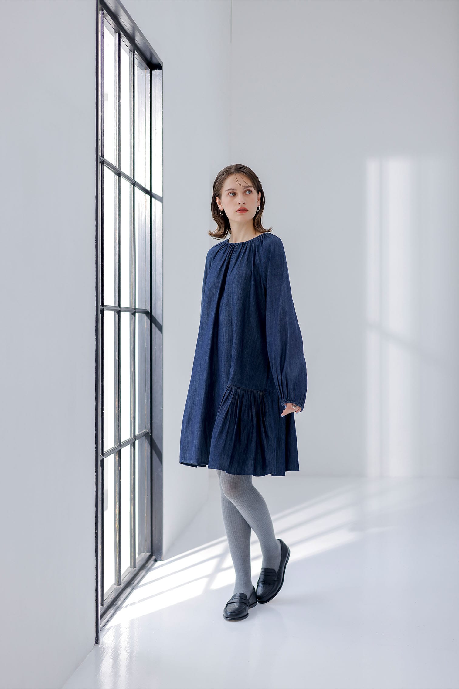 深みのあるダークカラーのデニムで仕立てたドレスSEYMOUR DENIM(シーモアデニム)。ギャザーを寄せたネックラインとサイドのティアードが動きに優雅なニュアンスを添えます。ロングパフスリーブとシェルボタンが上品なアクセント。ミニ丈ながらも洗練されたシルエットで、カジュアルにもシックにも着こなせる万能なドレスです。