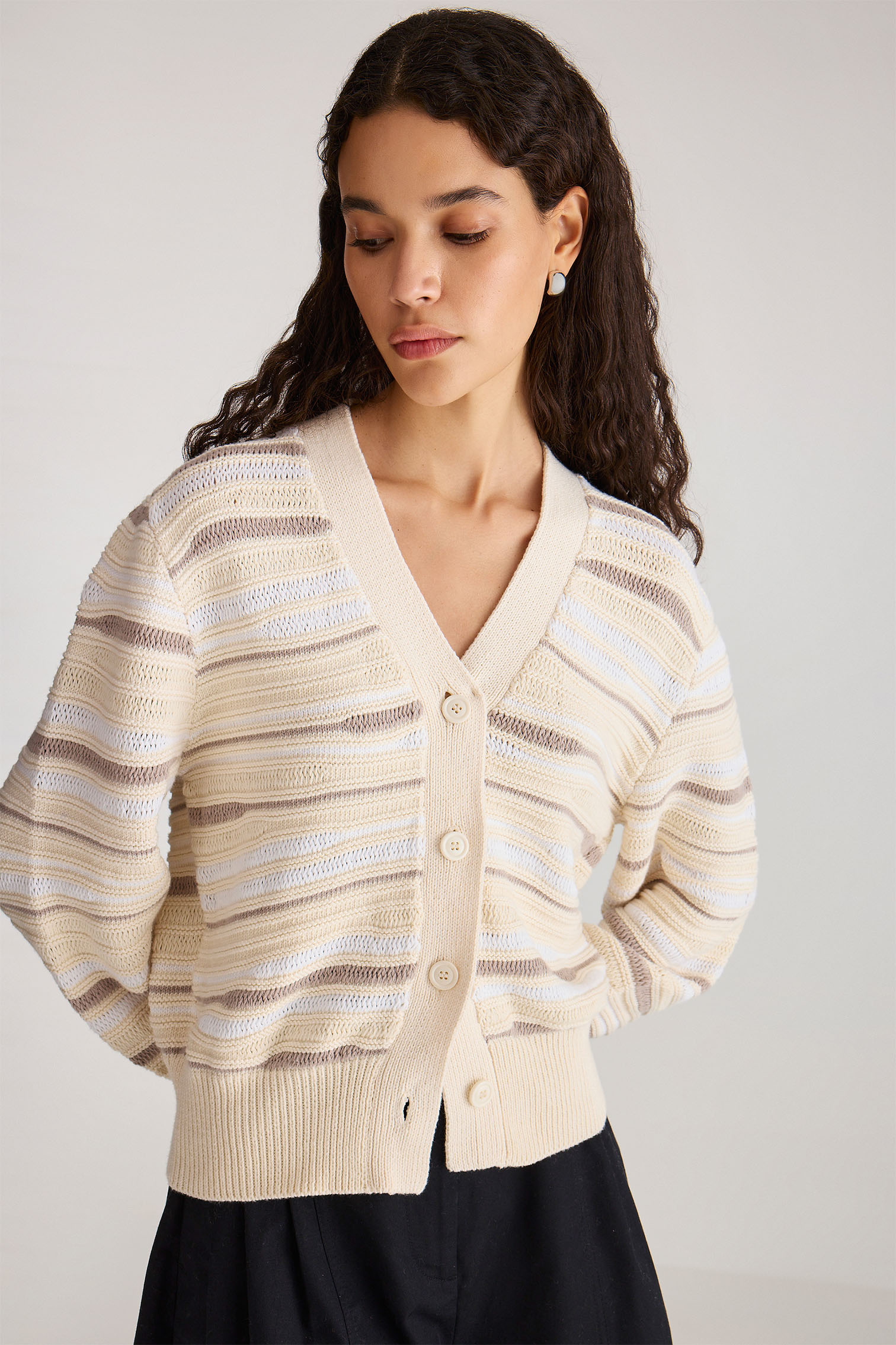 ALUNA KNIT(アルーナ)は、華やかな色使いが目を引くモダンなニットカーディガンです。100%ピマコットン糸を使用し柔らかく軽やかな着心地が魅力的。陶芸家トシコ・タカエズの色彩にインスパイアされた多色模様は、インターシャ技法によって丁寧に編み込まれ、まるでアートのような仕上がりに。クラシックなシルエットは、ドレスにもパンツスタイルにもぴったり。シーズンレスでスタイリングの幅も広がる、ワードローブに加えておきたいアイテムです。