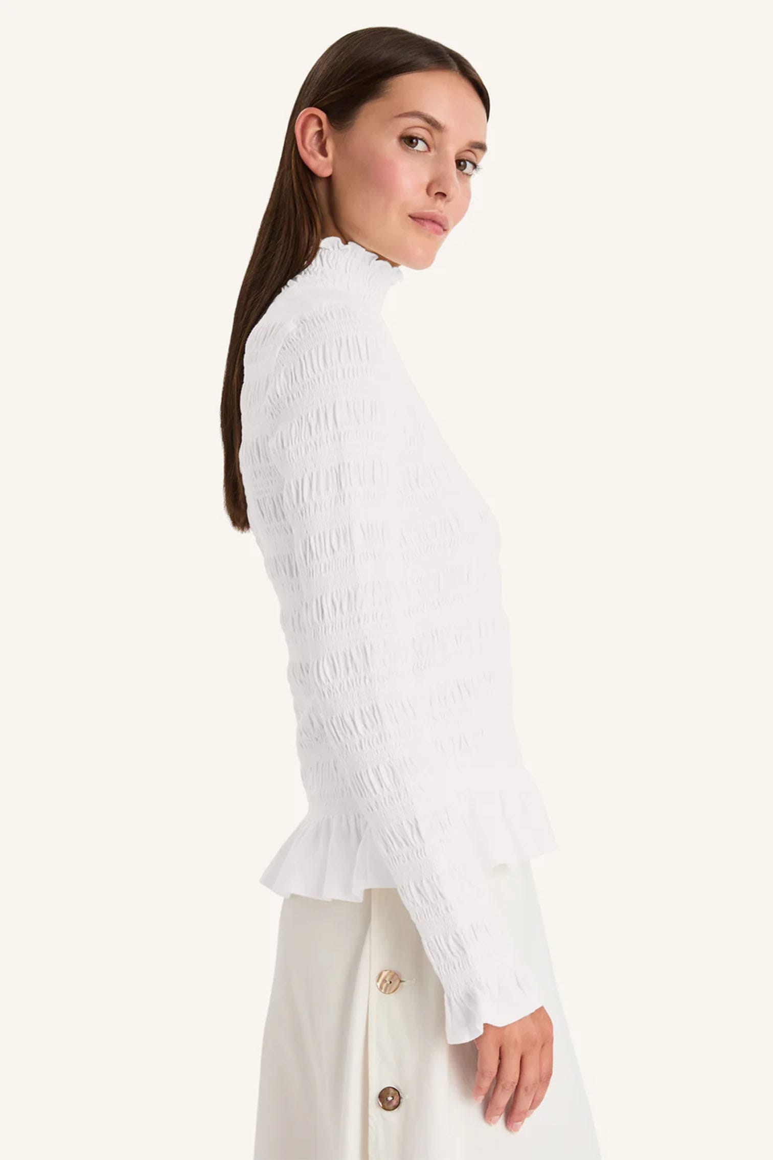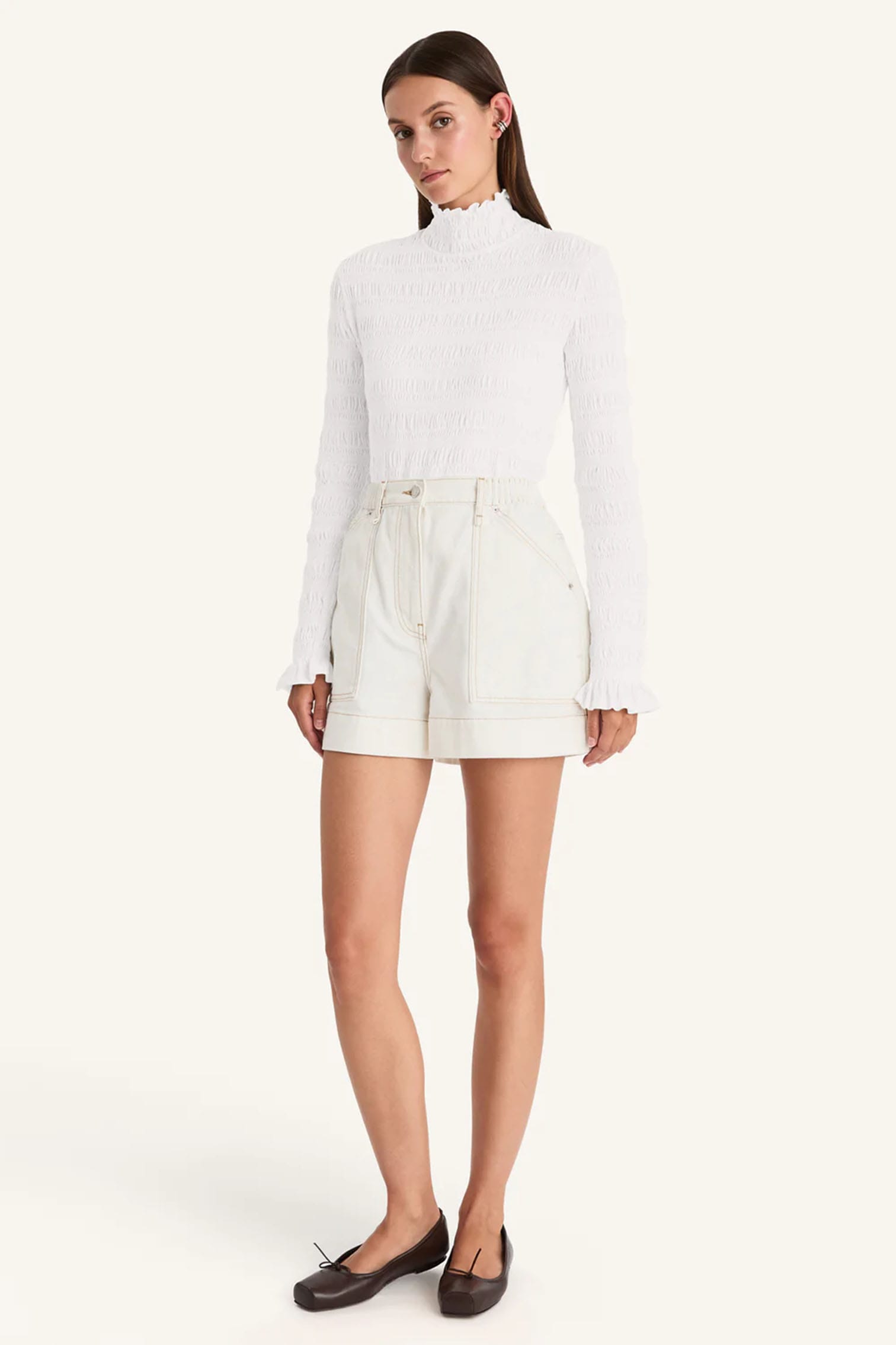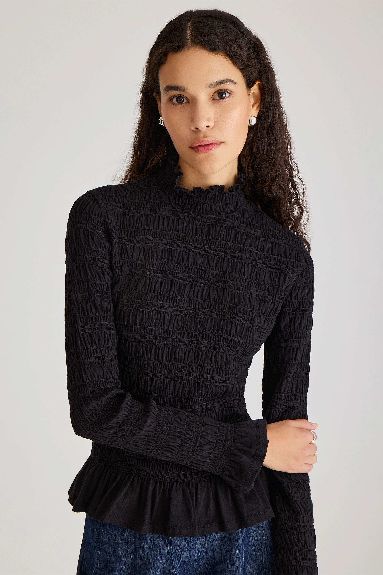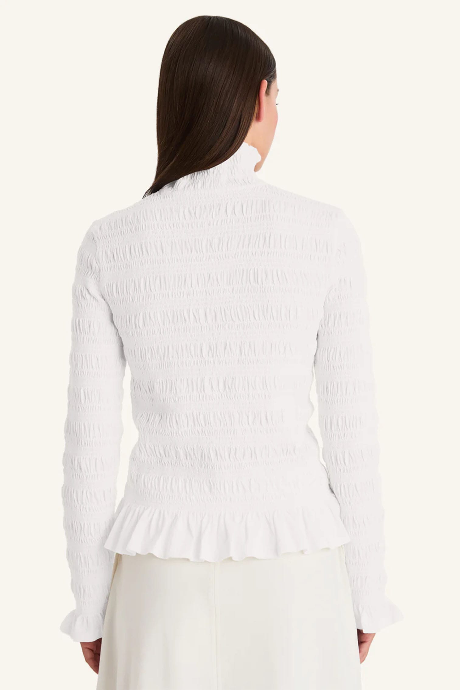 KANTOR TOP(カンター)は、着心地とデザイン性を兼ね備えたMerletteの定番アイテムです。中厚の100%コットンジャージー素材を使用しており、柔らかさとしっかりとしたフォルムの両方を楽しめます。全体に施されたスモッキング刺しゅうが自然なストレッチ性を生み出し、身体にフィットする快適な着心地を実現。袖と裾にあしらわれたフリルがほどよい華やかさをプラス。一枚で存在感があり、重ね着にも馴染む優秀なトップスです。